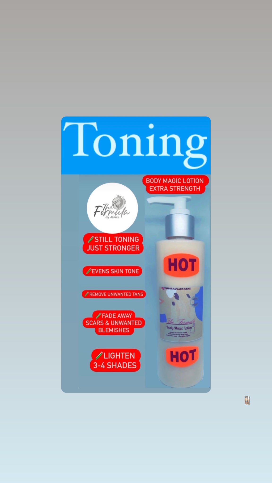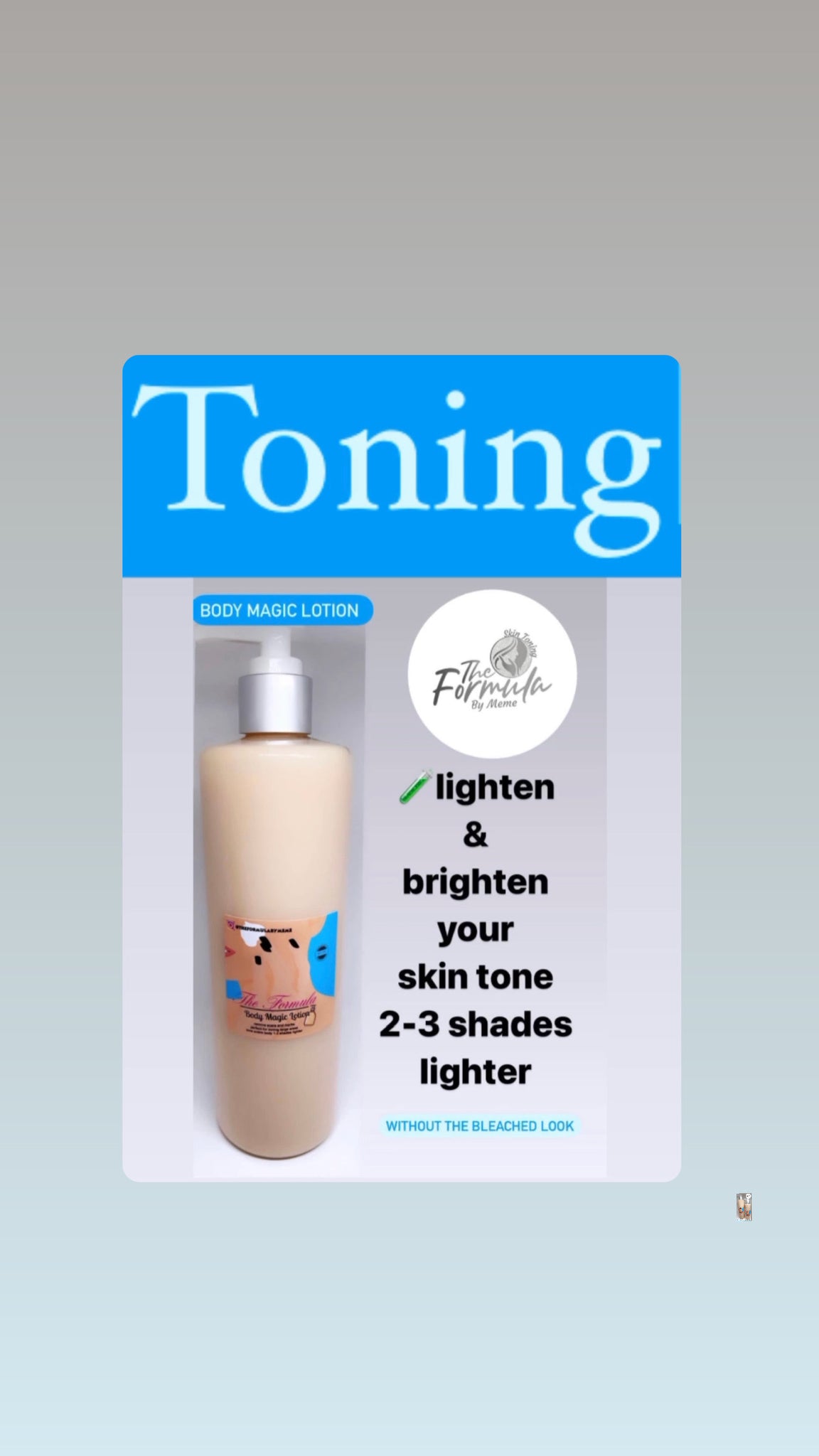 This was the first lotion MeMe recommended I try. It was by far the best cream I have ever used, literally in a three weeks spam I went 3 shades lighter !!! Meme is amazing and was so helpful in providing me tips on how to use the cream for the the maximum results! I couldn’t believe it in literally 3 weeks I was so light and very even tinned. You wouldn’t even know that bleached or lightened my skin.